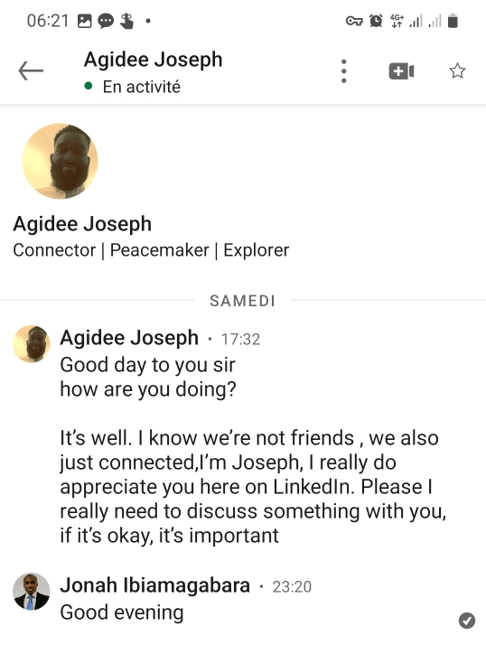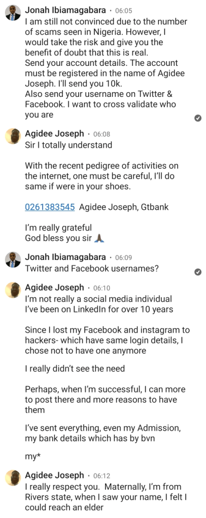 First, we begin with an elaborate social engineering scam on LinkedIn. A random person sent me a connection request and later reached out to plead for “transport fare” to assume duty at a government agency. I was not convinced that this was a genuine request, but having been in a situation where I needed money to travel for an interview, I decided to give this person the benefit of doubt. For me, it was better to lose the little money being requested to a scammer than having to risk a genuine person losing what could be a life-changing opportunity.