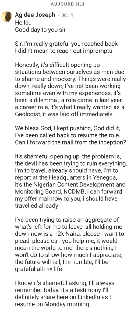 The screenshots above show my conversations with this person. I took a long continuous screenshot because something just did not feel right about the request. Lo and behold, I checked back a few days later and the entire conversation had disappeared, just as this scammer’s LinkedIn account had also vanished. So, some clown executed an elaborate scheme incorporating the right amounts of emotional inferences to make a call on my humanity just to get ₦10,000 (~US$14). Imagine if he had diverted such energy into a career in sales!